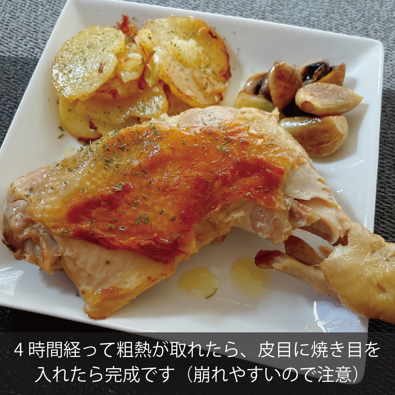 ②鶏肉の皮目に焼き目をつける際は柔らかくて崩れやすいので優しく扱ってください。