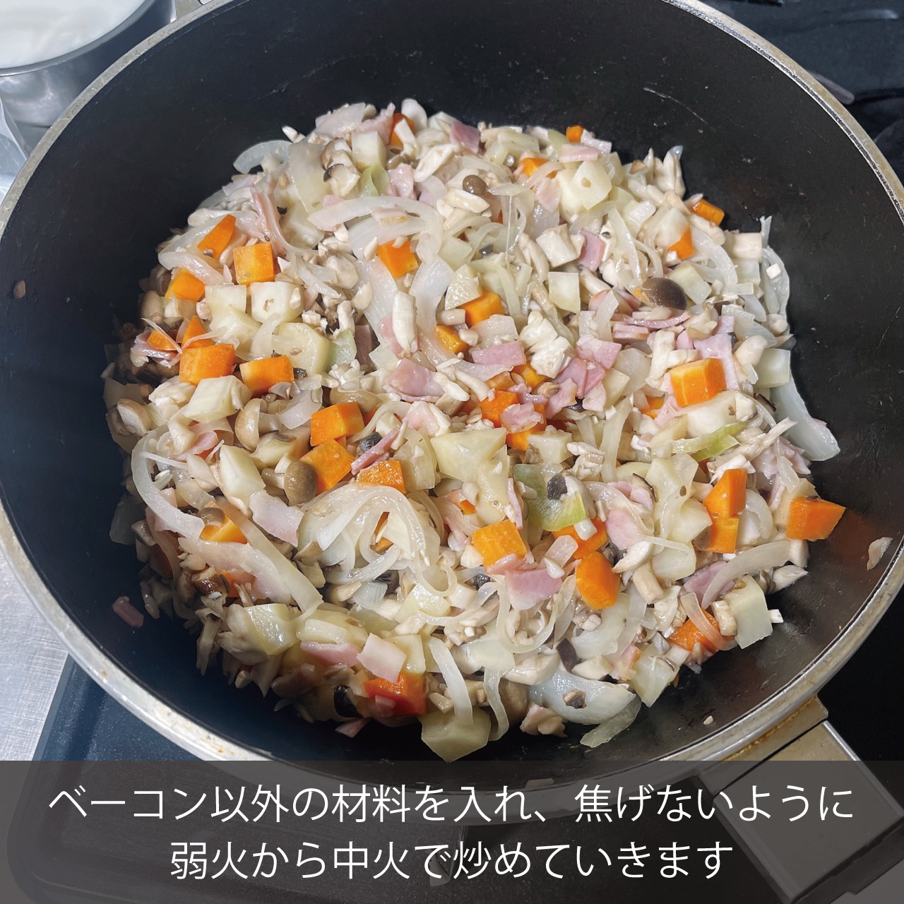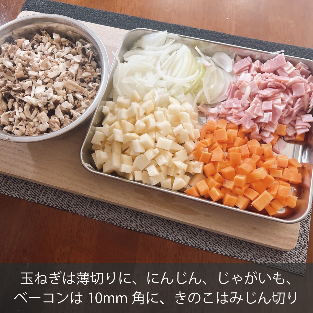 ②玉ねぎは薄切り、じゃがいも、にんじん、ベーコン、は10mm程度の角切り、きのこはみじん切りにします。