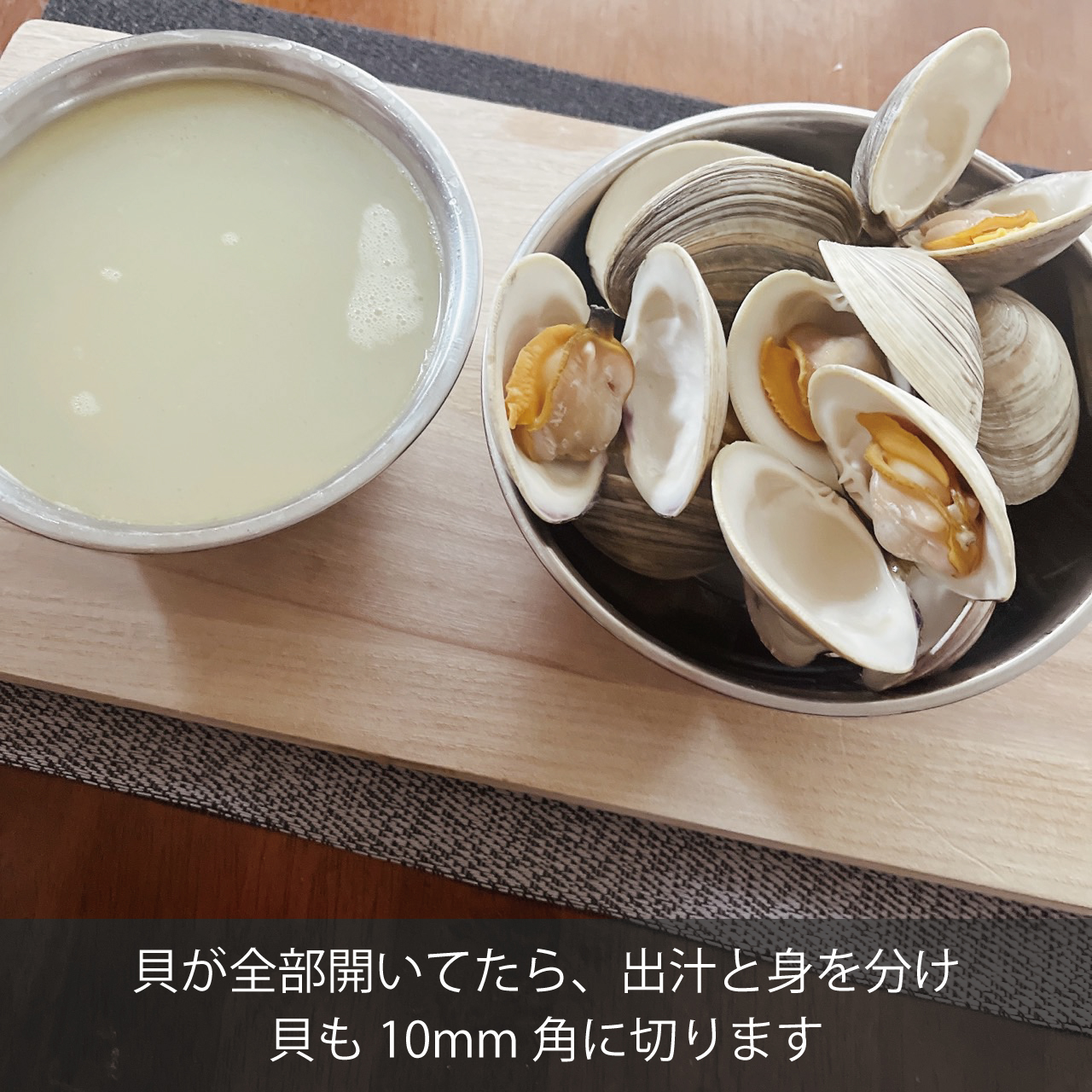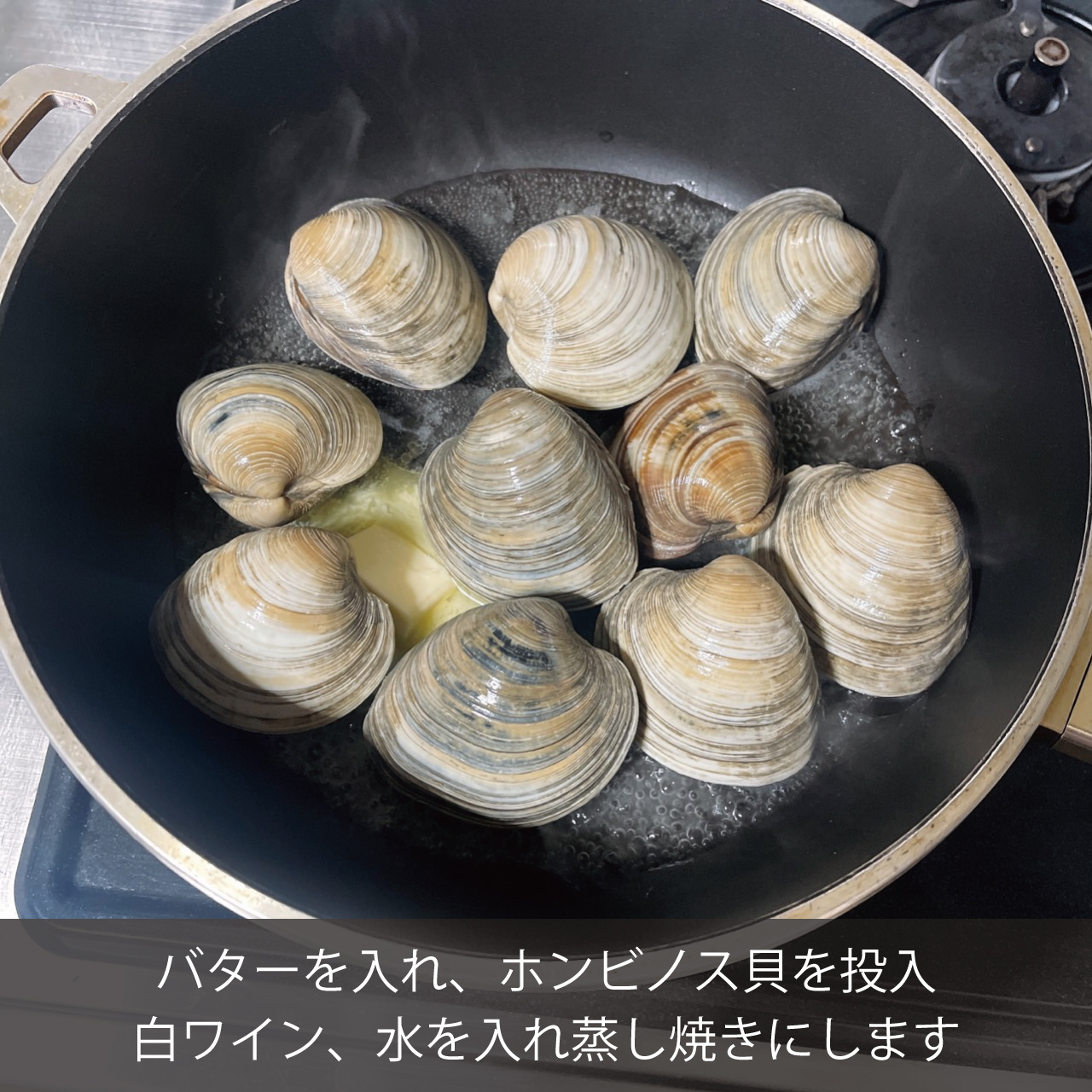 ②ホンビノス貝は塩分をかなり含んでいるので、味付けの塩加減に注意。