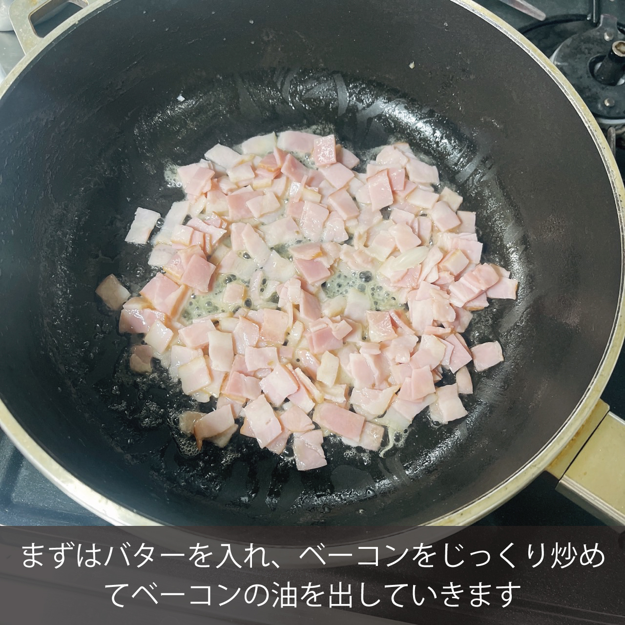 ④鍋に残りのバター20gを入れて、ベーコンを炒めます。油が出てきたら、玉ねぎ、にんじん、じゃがいも、きのこ、を加えて焦げないように中火~弱火の間くらいで炒めます。炒める際は木べらなどで野菜が崩れないようにやさしく炒めてください。しっかり炒めたら小麦粉が玉にならないように3回に分けて炒めます。小麦粉がしっかり炒められたら、貝出汁を加えてひと煮立ちさせアクを取ります。