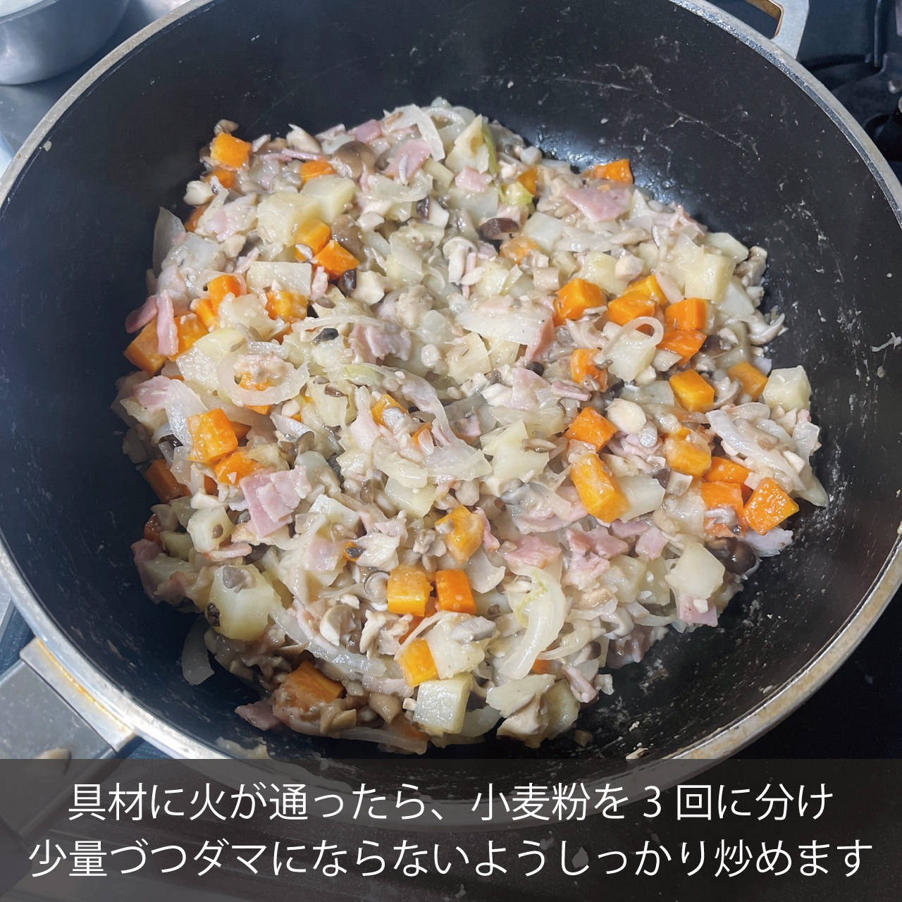 途中で具材に小麦粉を入れて炒めるのですが、小麦粉をしっかり炒める事でクリーミーな仕上がりになりダマになりずらくなります。