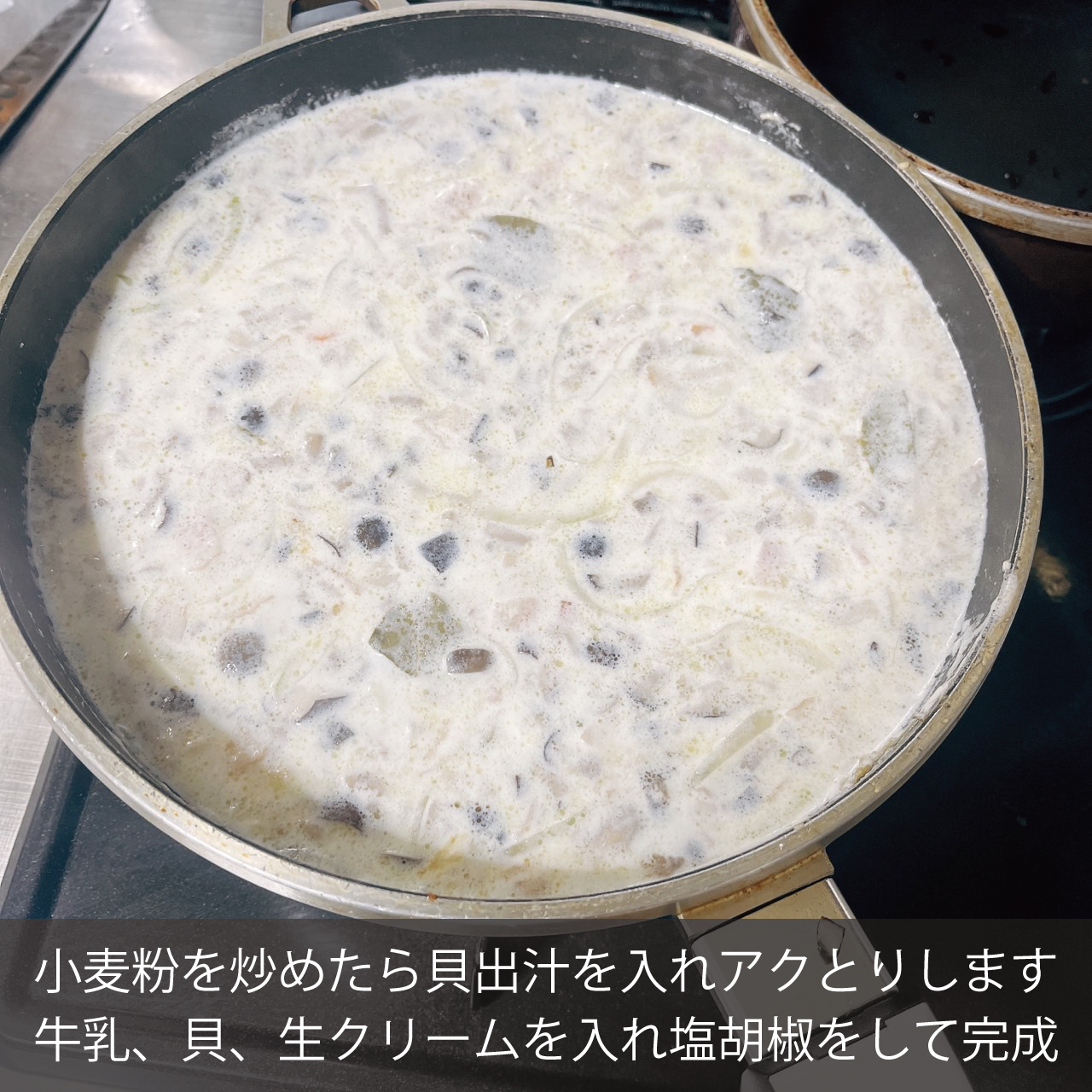 ⑤牛乳、貝、コンソメを加えひと煮立ちさせ、味をみて塩、黒胡椒、生クリームを入れます。貝の塩分があるので味を見てから塩を足すと失敗しません。(塩いらない時もあります)